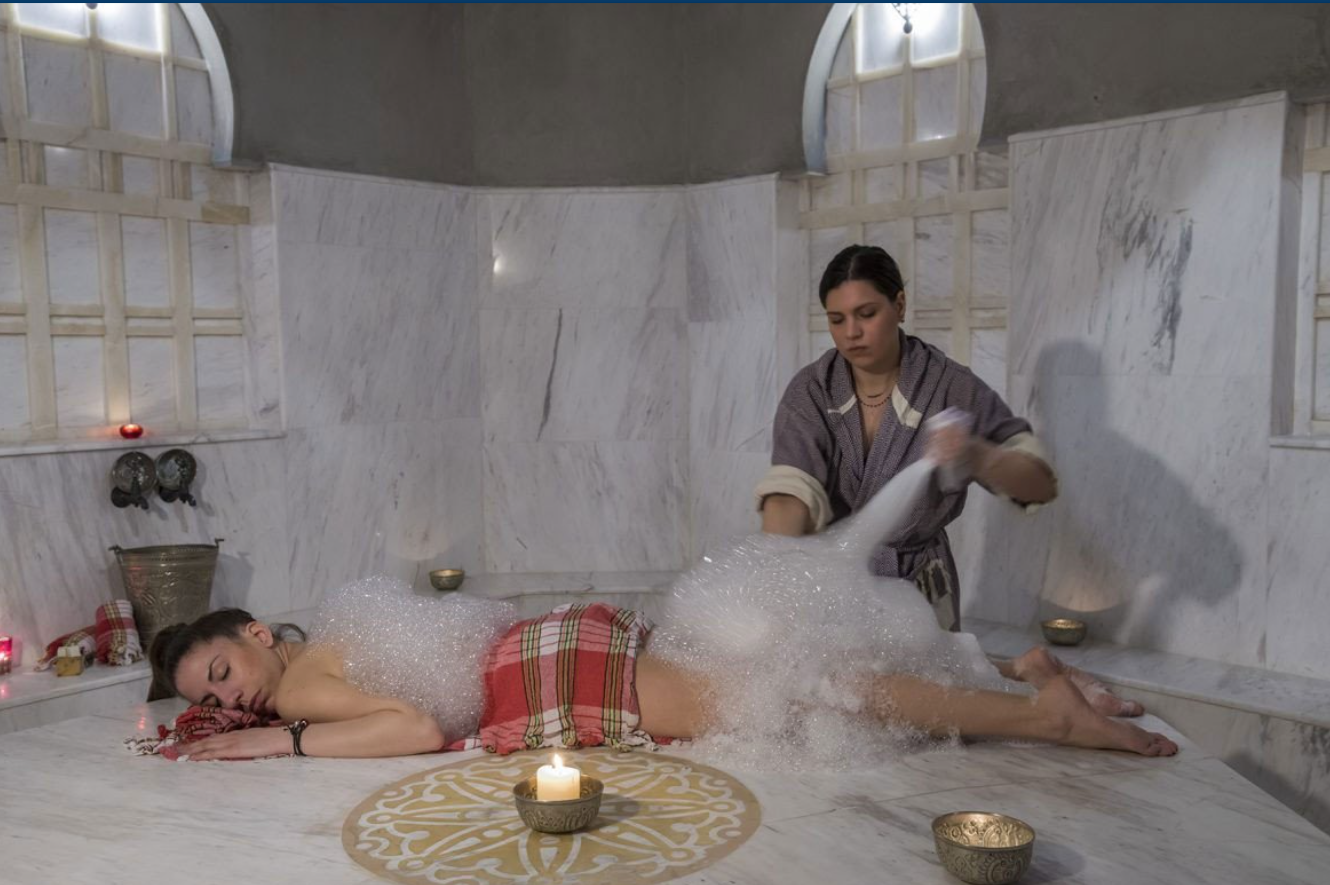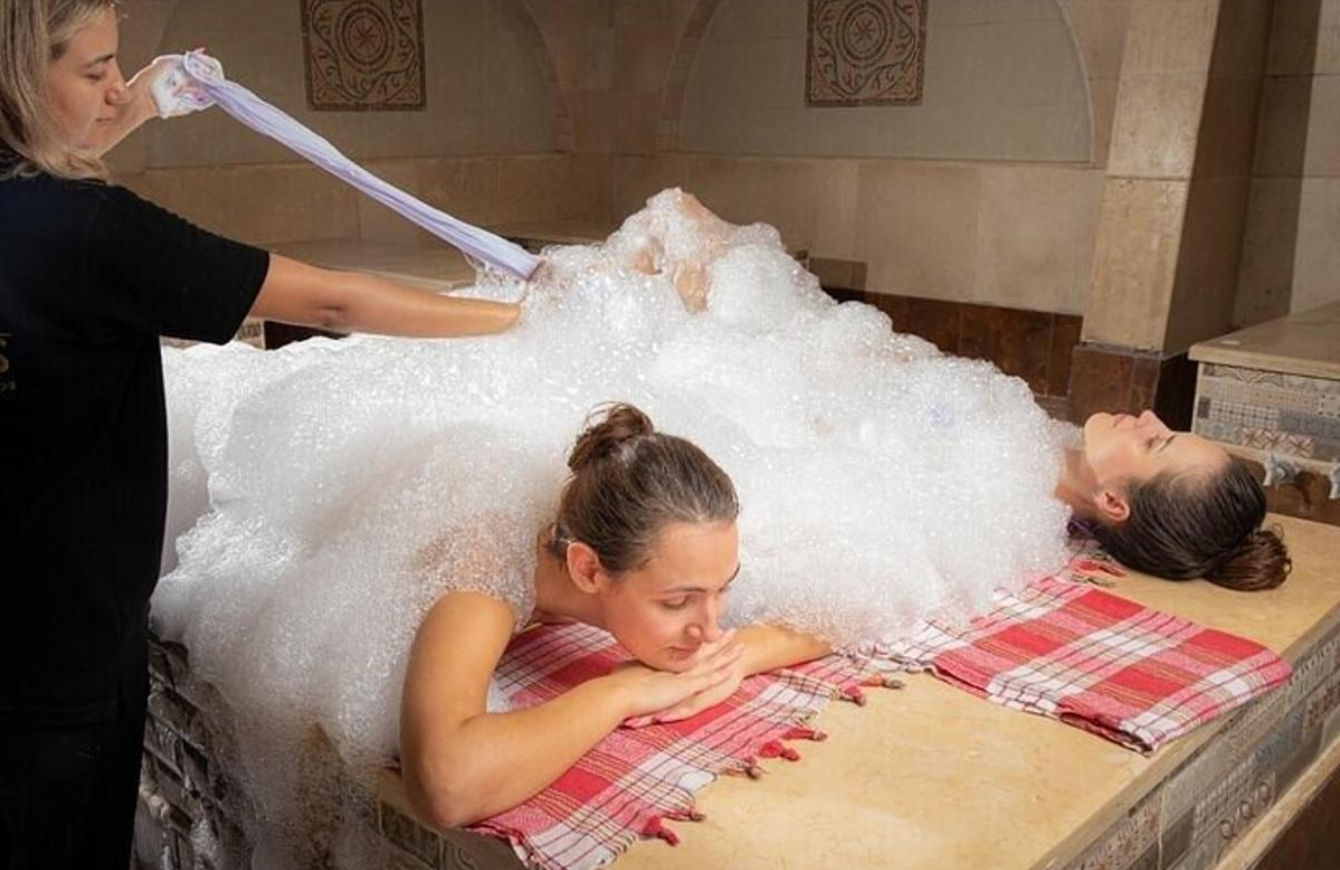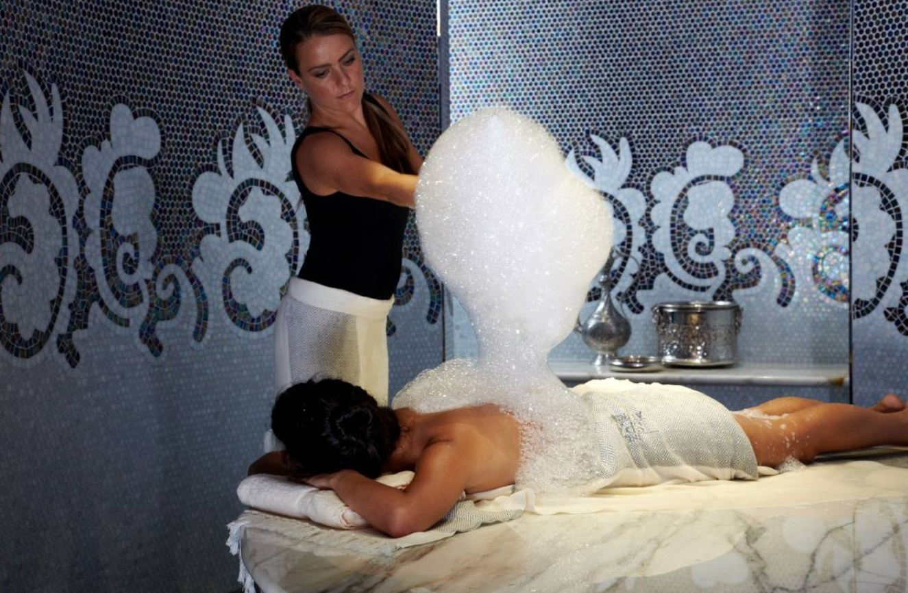 Sauna ve buhar odasında başlayan rahatlama süreci, kese ve köpük masajı ile devam eder; 60 dakikalık aromaterapi yağ masajı ile derin bir gevşeme sağlar.